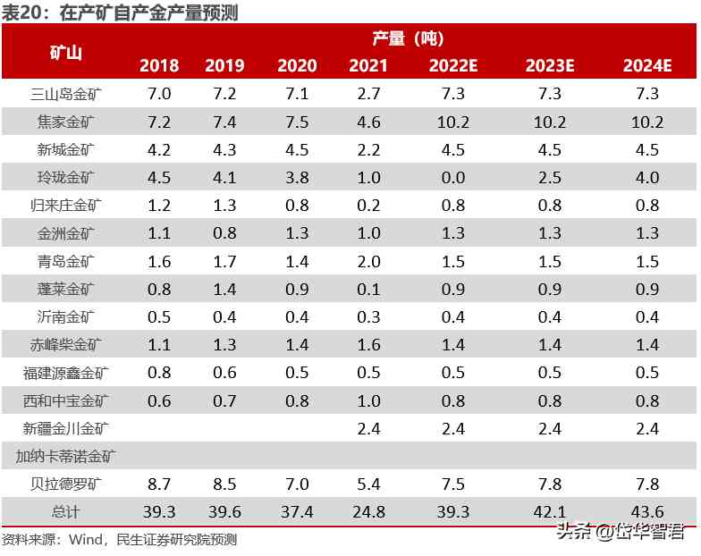 產(chǎn)量方面,2022年公司預(yù)計將完成年初39.27噸的產(chǎn)量規(guī)劃;2021年由于山東省安全檢查,玲瓏金礦停產(chǎn),目前國內(nèi)玲瓏金礦采礦權(quán)正在辦理中,預(yù)計2023年內(nèi)有望恢復(fù)生產(chǎn),貢獻增量,2021年公司收購天承礦業(yè),旗下馬塘礦區(qū)已整合焦家金礦,故2022年產(chǎn)量相比于2020年有所增加,我們假設(shè)其余各礦山未來的2年的產(chǎn)量與2020年(礦山正常生產(chǎn)年份)相比基本穩(wěn)定。預(yù)計2022-2024年自產(chǎn)金產(chǎn)量分別為39.3噸/42.1噸/43.6噸。