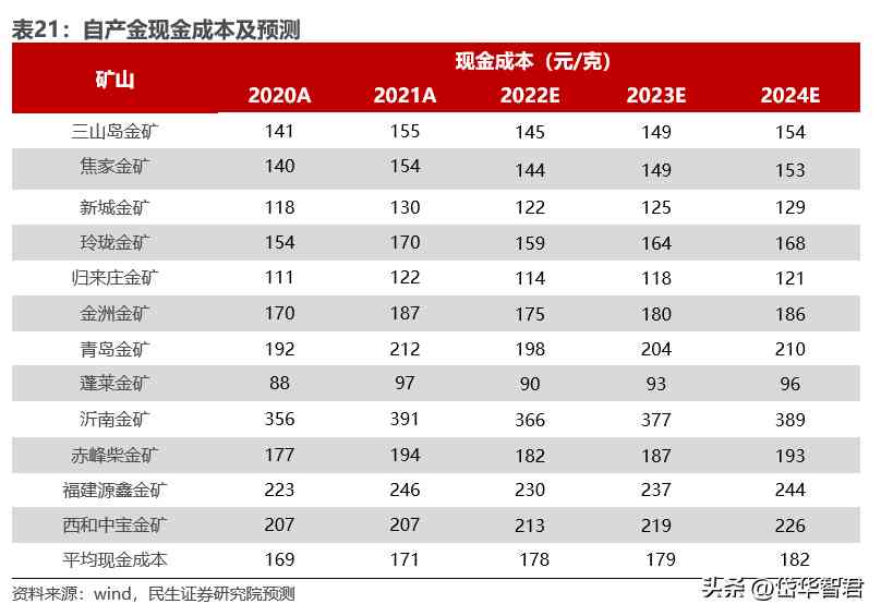 成本方面,受金礦入選品位的下降、原材料成本增加、安全管理費用支出增加等因素影響,預(yù)計公司自產(chǎn)金成本中樞后續(xù)每年小幅抬升,我們預(yù)計2022-2024年公司自產(chǎn)金平均生產(chǎn)運營成本分別為178元/克、179元/克、182元/克。