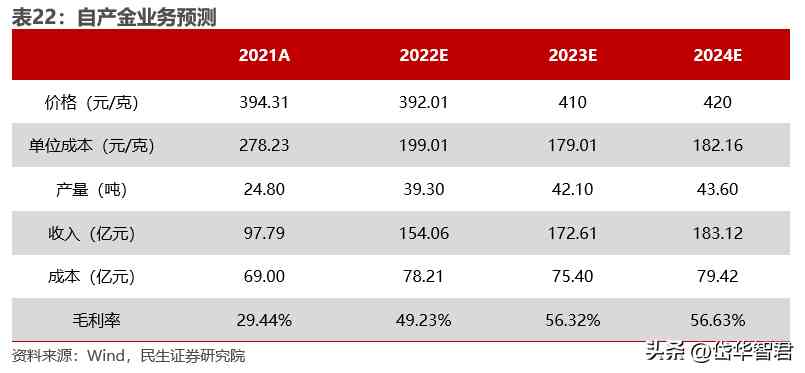 我們預(yù)計2022-2024年公司自產(chǎn)金營業(yè)收入為154.06/172.61/183.12億元,考慮到金價上行幅度大于成本上行幅度,公司自產(chǎn)金業(yè)務(wù)毛利率預(yù)計未來三年逐步提升,毛利率分別為49.23%/56.32%/56.63%。