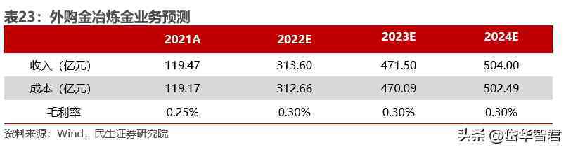 2)冶煉及精煉業(yè)務(wù):考慮到公司冶煉金產(chǎn)能逐步恢復(fù),受益于宏觀經(jīng)濟的復(fù)蘇,假設(shè)2022-2024的年冶煉金產(chǎn)量分別為80/115/120噸,毛利率維持在0.30%,外購小金條業(yè)務(wù)產(chǎn)量分別為20/20/20噸,毛利率維持在0.15%,對利潤形成一定貢獻。