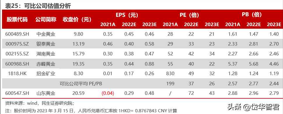 以2023年3月15日股價為基準,2022-2023年可比公司平均PE分別為37倍和26倍,山東黃金PE為72和43倍;2022-2023年可比公司PB分別為2.77和2.44倍,山東黃金PB為2.96和2.79倍。