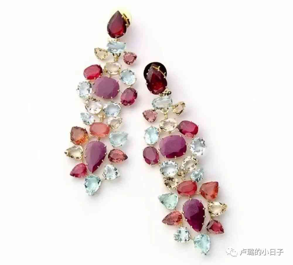 這款耳環(huán)用了不少顏色和材質(zhì)各異的寶石組合而成,有紅寶石、黃水晶、綠柱石、粉紅色碧璽和鉆石。