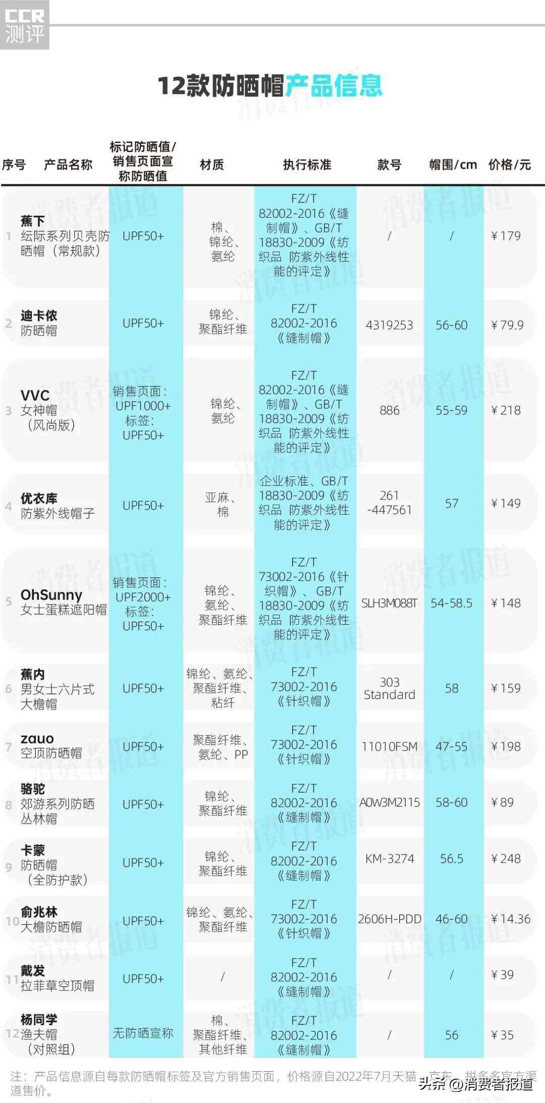 2022年8月,《消費(fèi)者報(bào)道》檢測(cè)了市面上12款熱門防曬帽,有沒有你正在戴的呢?