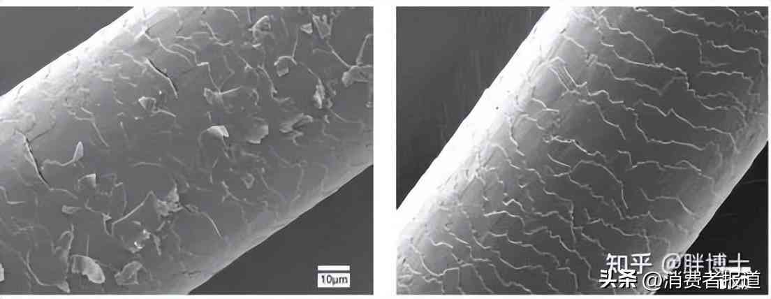 ▲紫外線下受損的毛鱗片(左)和正常的頭發(fā)對(duì)比(右)