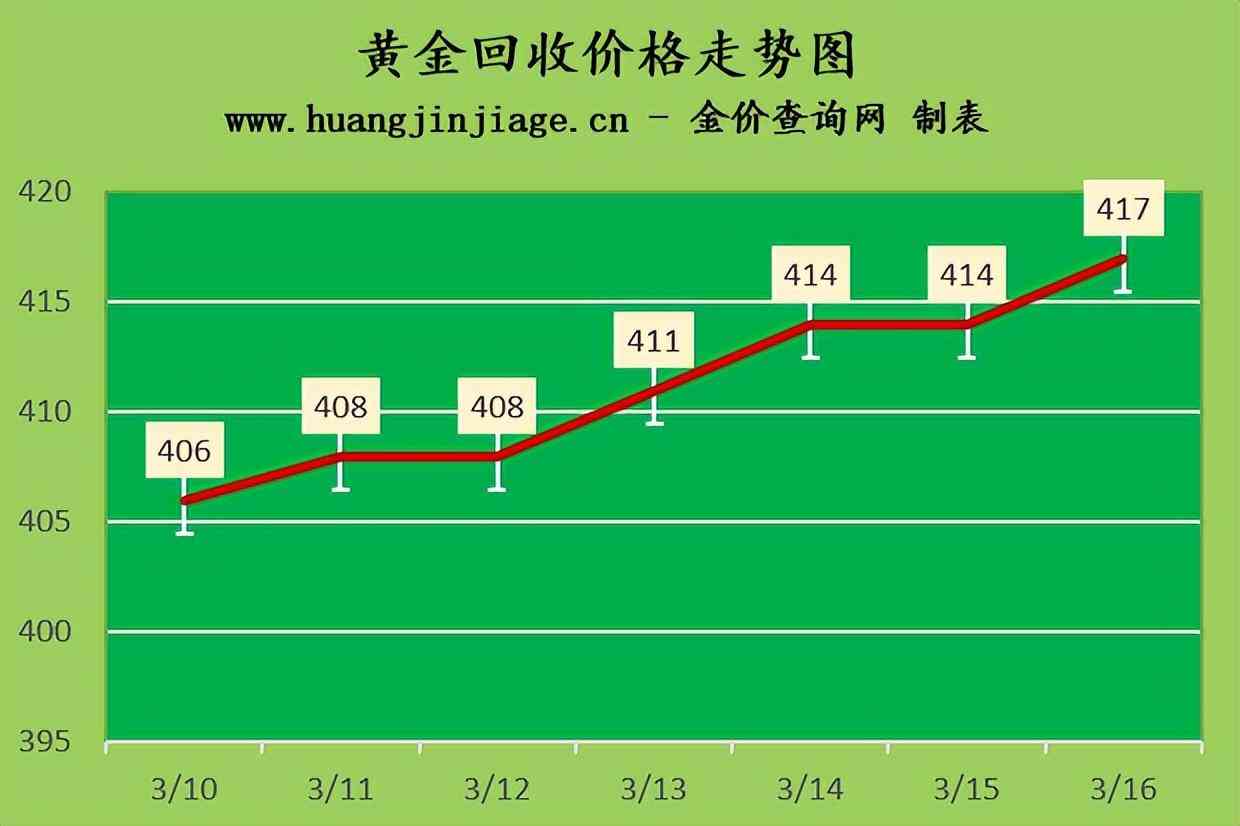 黃金回收價(jià)格417元/克,鉑金回收價(jià)格186元/克,鈀金回收價(jià)格294元/克,18K金回收價(jià)格305元/克,銀條回收價(jià)格3.6元/克。(黃金行情是波動(dòng)的,回收金價(jià)沒(méi)有固定標(biāo)準(zhǔn)。)