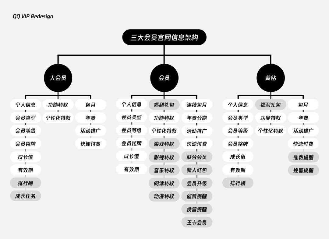 接下來從業(yè)務(wù)角度出發(fā),分別梳理三大會員體系官網(wǎng)的信息架構(gòu)。根據(jù)三大會員所涵蓋的業(yè)務(wù)內(nèi)容不同,官網(wǎng)中所包含的信息也有所不同。