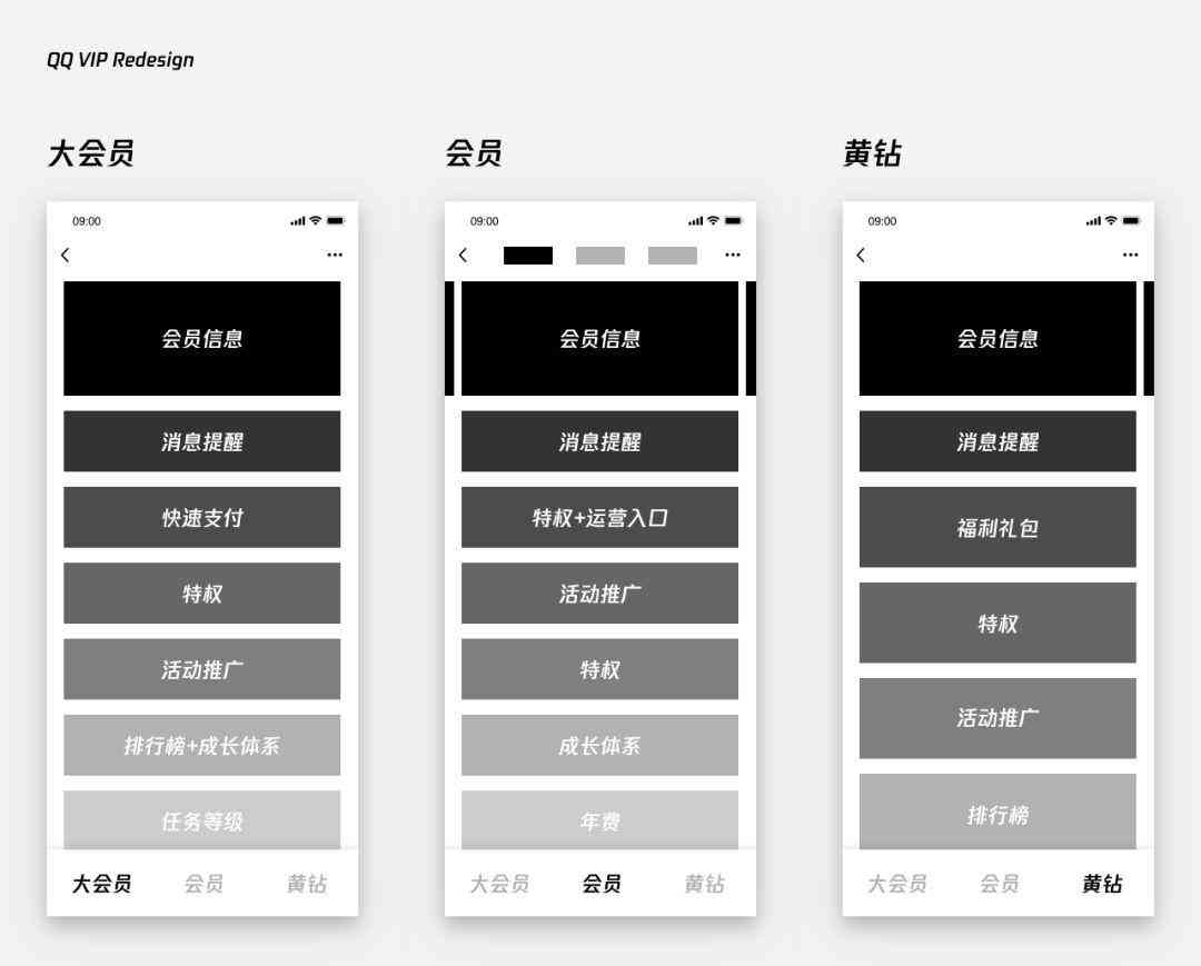 首先確定導航結(jié)構(gòu),由于QQ會員的業(yè)務(wù)結(jié)構(gòu)在三大會員體系中相對復(fù)雜,存在二級業(yè)務(wù)導航,為了避免兩層導航在頂部占用頭部高度,讓頭部顯得層級多,所以把一級導航放在了頁面底部,二級導航放在頁面頂部,對于沒有二級導航的黃鉆和大會員來說只存在底部的一級導航。
