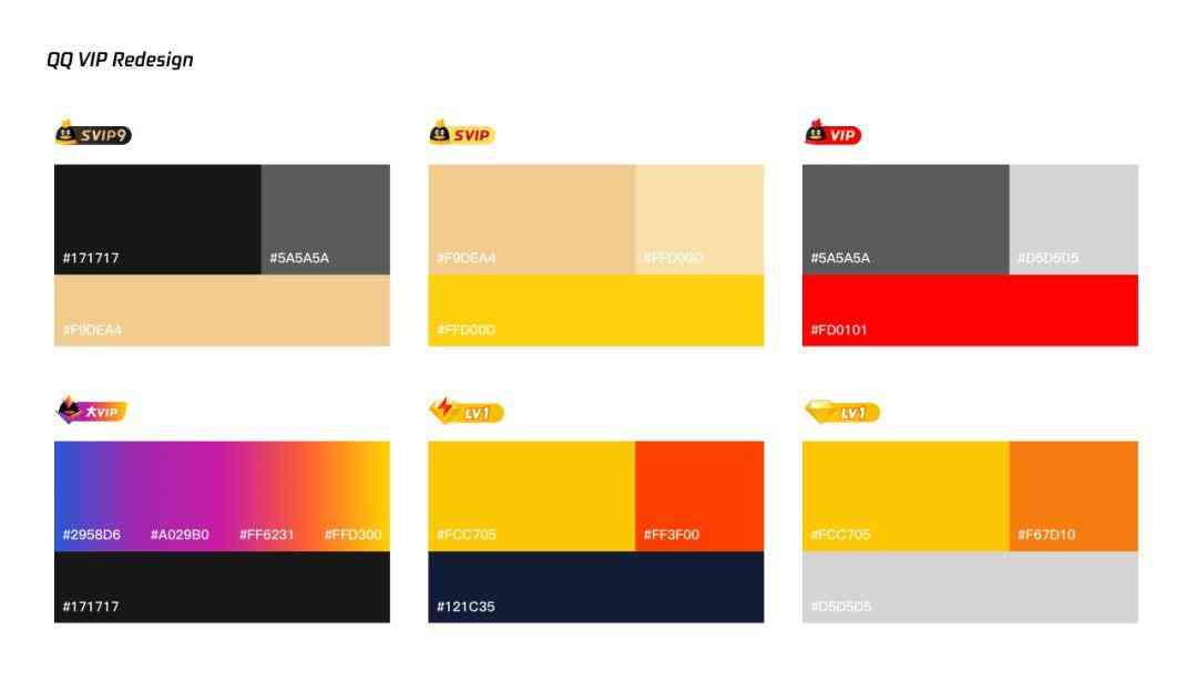 “視覺識別系統(tǒng)”是品牌調(diào)性的核心,決定了不同產(chǎn)品的延續(xù)性。將用戶已認知的“普通會員”、“超級會員”、“普通黃鉆”和“豪華黃鉆”進行了延續(xù),對新推出的“大會員”進行了特殊的炫彩漸變色設(shè)計,在這些會員系統(tǒng)的標準配色中結(jié)合不同會員體系的等級差異新增了輔助色系,提升產(chǎn)品的識別度。