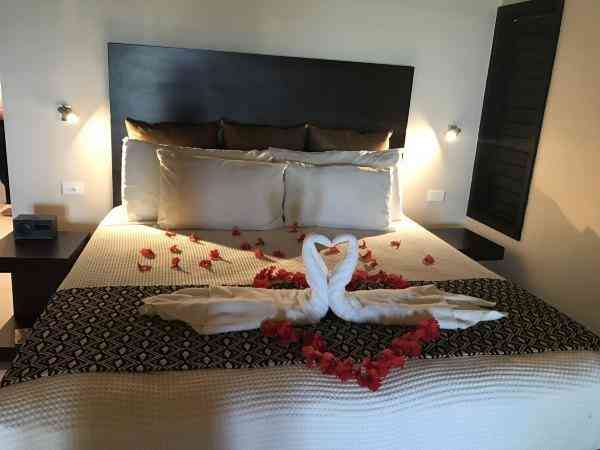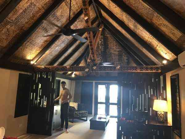 我們住的是的Matamanoa Island,上島后會有島上的工作人員唱歌跳舞的歡迎儀式,花環(huán)again~ 因?yàn)橥鈲u酒店基本也都是一島獨(dú)立的,所以基本沒有什么check in流程,大堂其實(shí)就是Bar 的前桌,在核實(shí)了護(hù)照號后就開始介紹島上每日的安排:用餐時(shí)間、每日活動安排,詢問處及各處位置等,最后還抱歉的告訴我們,每天晚上都會有一大群鳥從不知道哪里飛過來過夜,可能會有一些吵雜(實(shí)際上除了這鳥的叫聲像嬰兒啼哭般恐怖外,沒什么毛病~)我們申請的蜜月房,房型是沙灘海景房,內(nèi)飾如下(忽略赤膊的我)