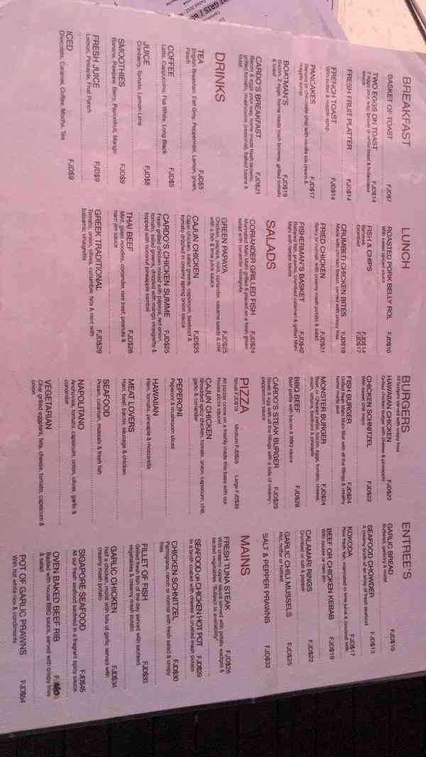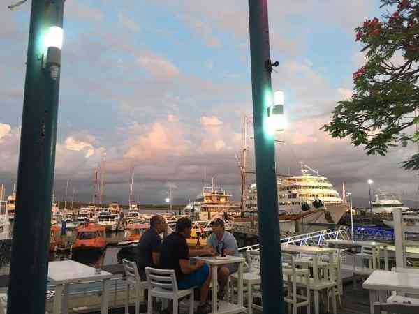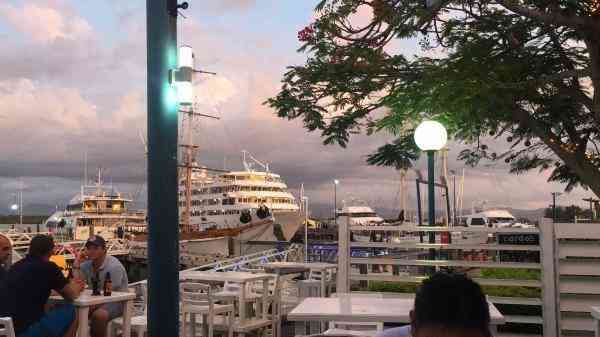 楠迪down town的整體跟巴厘島的街道有種相似感,但要更小,更樸素一些,商業(yè)成分沒有巴厘島那么重,更像是一個(gè)只面向本地人的采購中心;前方高潮*因down town的街道本身就不長,范圍也有限,看著時(shí)間差不多,我倆就想著找個(gè)當(dāng)?shù)氐牟蛷d吃個(gè)午飯,沒有選擇網(wǎng)評火熱的渤海酒家,而是選了一家在主干道街邊的當(dāng)?shù)夭蛷d,吃的東西也無非是咖喱、海鮮之類的(斐濟(jì)有很多印度人),在我們快吃完的時(shí)候,Waitress一臉緊張的過來,對我們說一會可能會有幾個(gè)人過來借我們的手機(jī)打電話(打電話還是拍照沒聽清,Waitress口音太重),讓我們警惕不要借給他們,他會換掉我們的手機(jī),聽罷我們趕緊結(jié)賬離開,在出門時(shí)正好和剛才Waitress指的那個(gè)人擦肩而過,回頭致謝Waitress時(shí)她還在一個(gè)勁的揮手讓我們離開*后來通過酒店waiter了解到,一部iPhone7 plus在當(dāng)?shù)刭u到7000 FIJI刀,合人民幣2W多,加上FIJI當(dāng)?shù)孛褡?、人員混雜,而治安并不理想,這種事情層出不窮也可理解。在此也提醒各位如前往down town切勿離中心區(qū)太遠(yuǎn)、不漏財(cái)多低調(diào)~從餐廳出來后打了輛車就返回了酒店,因DENARAU碼頭離酒店很近,步行距離最多15分鐘就到,而且在度假區(qū)這邊治安較好,閑人難入,所以在安全方面也ok,在酒店休息到傍晚,換上拖鞋,就可以往DENARAU碼頭走起了,在天乘渡輪時(shí)就路過看見有好多餐廳在碼頭區(qū)域,其中一家緊挨岸邊,整個(gè)港口的景色收入眼底,所以直接就去他們家了(位置在hard rock餐廳旁邊) ↓↓↓↓↓