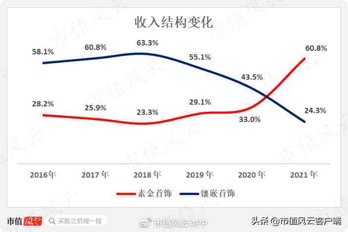 五年來(lái)鑲嵌首飾一直都是公司最重要的收入來(lái)源,到了2021年,這最重要的角色已經(jīng)變成了素金首飾,占總收入的比重已超過(guò)60%。