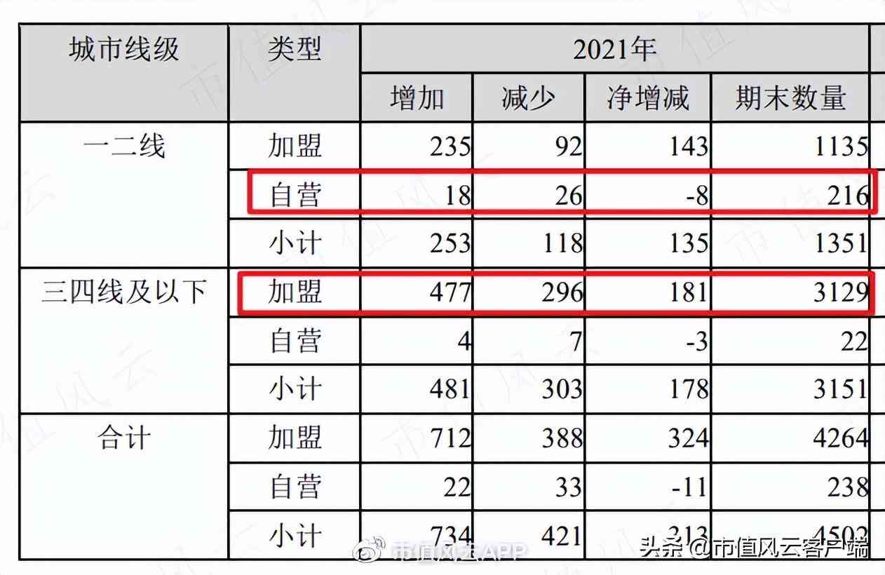 例如2021年末,73%的加盟店都在三四線(xiàn)及以下城市,91%的自營(yíng)店都位于一二線(xiàn)城市。