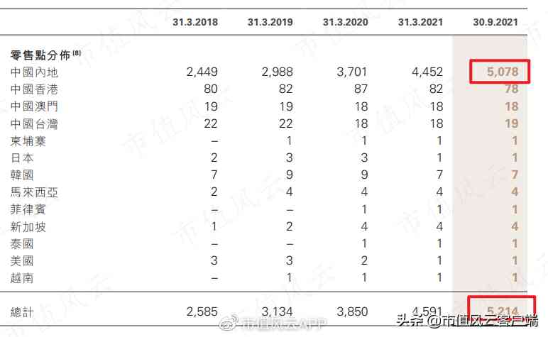 截至2021年9月末,周大福全球共有門(mén)店5214家,中國(guó)大陸就有5078家,占比97%。