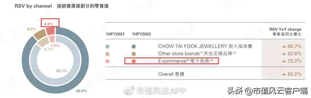 例如周大福在截至2021年9月末的6個(gè)月內(nèi)電商業(yè)務(wù)占中國(guó)大陸收入的比例為4.9%。而周生生的這一數(shù)據(jù)則為11.1%。很明顯周生生的電商化程度高于周大福。