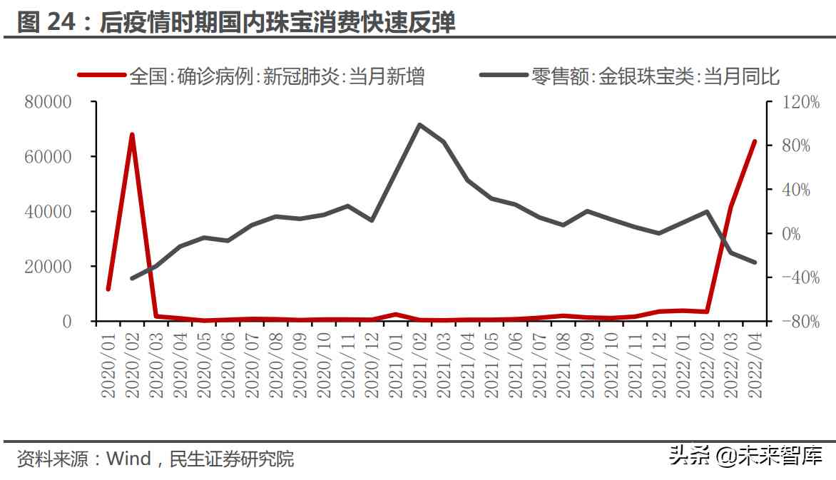 2020 年新冠疫情爆發(fā),大量居民婚慶被迫推后,但婚慶剛需屬性較強, 所以 2020 年消費需求同比大幅下降-27.5%之后,于 2021 年同比上升 +45.0%;對比之下,在相同的時間區(qū)間內(nèi),新冠疫情、國際地緣沖突、 美聯(lián)儲出臺貨幣寬松政策之后又數(shù)次釋放加息預期的信號等多方因素共 同對金價施加影響,盡管利好多于利空,但整體并不強烈,所以 2020 年 金價小幅上漲之后再度進入震蕩區(qū)間,對投資需求的拉動比較溫和。在這 一階段,國內(nèi)珠寶行業(yè)的周期主要由黃金消費需求主導。(報告來源:未來智庫)