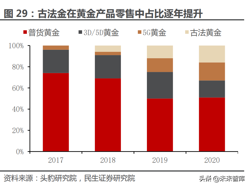 頭部品牌加快推出古法金新品,產(chǎn)品結構優(yōu)化驅動行業(yè)實現(xiàn)高增長。古法金由 周大福率先推出,由于具備克重足、外觀古色古香并融入更多文化元素等優(yōu)勢,所 以受到消費者的廣泛歡迎。據(jù)頭豹研究院數(shù)據(jù),2018-2020 年古法金在黃金產(chǎn)品 零售中的占比由 6%左右快速提升至 16%左右;2021 年以來,周大生推出“非凡 金”系列,老鳳祥推出“藏寶金”系列,均為古法金產(chǎn)品,頭部品牌在新品類上的 持續(xù)發(fā)力進一步推動了古法金滲透率的提升,考慮到古法金產(chǎn)品單位價值量顯著 高于普貨黃金,所以行業(yè)產(chǎn)品結構改善成為規(guī)模高增長的驅動因素之一。