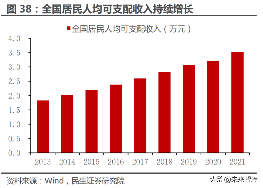 與發(fā)達地區(qū)相比,我國人均珠寶消費額偏低,中長期提升空間充足。據(jù)金投珠 寶數(shù)據(jù),2019 年內(nèi)地人均珠寶消費額為 69 美元,同期中國香港和美國則分別為 787 美元與 223 美元,分別是內(nèi)地的 11.5 與 3.2 倍,與發(fā)達地區(qū)相比,內(nèi)地人均 珠寶消費額仍有較大提升空間。上文已經(jīng)提到,珠寶作為可選屬性極強的消費品, 其規(guī)模與人均可支配收入水平高度相關,據(jù) Wind 數(shù)據(jù),2013-2021 年內(nèi)地人均 可支配收入由 1.83 萬元增長至 3.51 萬元,成為珠寶行業(yè)擴容的核心動力之一; 同時,近年來內(nèi)地中產(chǎn)階級人口規(guī)模有所擴大,據(jù)頭豹研究院數(shù)據(jù),2012-2018 年 內(nèi)地中產(chǎn)階級人口占比由 68%提升至 77%,這也成為拉動內(nèi)地珠寶需求持續(xù)增長 的因素之一。綜上,我們認為未來隨著我國居民人均收入水平提高,特別是中高收 入人群規(guī)模擴大,珠寶行業(yè)的市場空間將繼續(xù)穩(wěn)步增長。