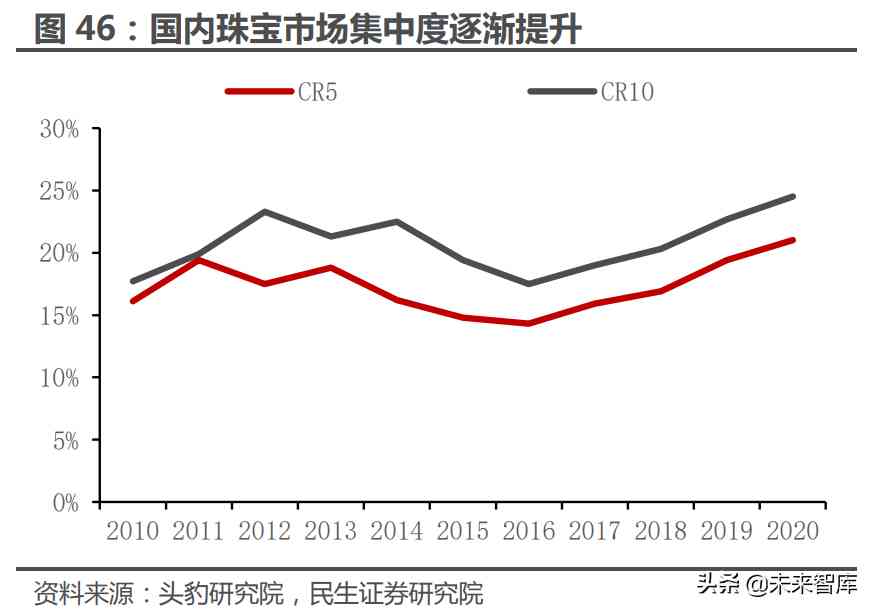 近年來國內(nèi)珠寶行業(yè)集中度逐年上行,但理論提升空間仍然顯著。據(jù)頭豹研究 院數(shù)據(jù),2016 年以來,我國珠寶行業(yè) CR5 由 14.3%提升至 21.0%,CR10 由 17.5% 提升至 24.5%,行業(yè)集中度持續(xù)上行;但是,橫向對比之下能夠發(fā)現(xiàn)集中度提升 空間仍大,據(jù)歐睿數(shù)據(jù),2020 年中國香港珠寶行業(yè) CR10 達到 56%,日本達到 49%,雖然美國僅有 9%,但考慮到居民的文化傳統(tǒng)與消費習慣的差異性,中國香 港與日本市場或更有參考價值。從這一角度來看,國內(nèi)珠寶市場集中度在理論上仍 有較大的提升空間,我們將在下文探討行業(yè)集中度的提升路徑。
