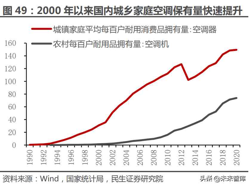 空調(diào)行業(yè)早期下沉市場需求廣闊,產(chǎn)業(yè)矛盾主要存在于供給側,渠道拓展是企 業(yè)快速發(fā)展的核心驅動力。我國家用空調(diào)行業(yè)發(fā)展開始于 20 世紀 80 年代中期, 從國家統(tǒng)計局公布的空調(diào)百戶保有量數(shù)據(jù)來看,城鎮(zhèn)市場滲透率提升速度快于農(nóng) 村,我們認為主要有兩方面原因,一是城鄉(xiāng)居民的購買力水平存在差異,二是低線 城市包括農(nóng)村渠道體系相對欠缺,需求無法被及時滿足。從城鎮(zhèn)化率水平來看,行 業(yè)早期大量人口居住于農(nóng)村及低線城市,說明下沉市場存在規(guī)模龐大的需求紅利, 而彼時空調(diào)廠商的渠道集中于一二線城市,激烈競爭之下市場格局比較分散,據(jù)美 的電器招股書,1992 年全國空調(diào)產(chǎn)量達到 300 萬臺,共有 80 余家生產(chǎn)企業(yè),但 沒有任何一家規(guī)模超過 40-50 萬臺。在這樣的背景之下,通過渠道拓展向低線城 市及農(nóng)村拓展成為企業(yè)快速成長的關鍵所在,這與我國珠寶行業(yè)現(xiàn)階段通過加盟 形式向低線市場進行下沉存在異曲同工之處。