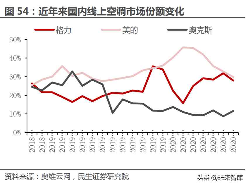 空調(diào)龍頭在渠道擴張收割低線市場紅利階段沉淀的品牌優(yōu)勢幫助其更從容的 應對渠道變革沖擊,并逐步獲得產(chǎn)品溢價能力??照{(diào)行業(yè)在電商崛起之后迎來渠道 變革沖擊,奧克斯等長尾品牌在線上渠道的市占率一度超過美的與格力,但是這種 借助時間差而非品牌力獲取的市場份額難以長期維持,龍頭積極布局線上渠道之 后其市占率便大幅下降。而且,在這一過程中,隨著消費者對龍頭公司品牌力認可 度提升,美的與格力空調(diào)產(chǎn)品的盈利能力也呈現(xiàn)出長期走強的趨勢。