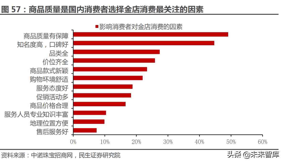 國內(nèi)珠寶龍頭產(chǎn)品質量與口碑強于區(qū)域市場的長尾品牌,下沉市場具備集中 度提升基礎。由于珠寶單位價值量高,且現(xiàn)階段產(chǎn)品相對同質化,特別是對于收入 水平較低的下沉市場消費者而言,產(chǎn)品質量是其最為關注的因素,而口碑與知名度 則是產(chǎn)品質量最好的背書。龍頭品牌長期以來深耕一二線城市,在口碑與知名度上 已經(jīng)形成一定積累,因此具備擴大市場份額的基礎。