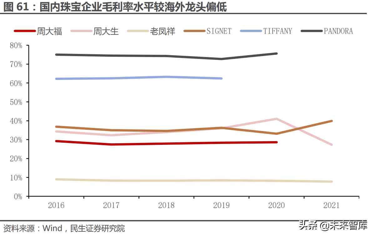 珠寶龍頭后續(xù)若實現(xiàn)渠道紅利向品牌紅利轉化,長期盈利能力仍將有進一步 上行空間。據(jù) Wind 數(shù)據(jù),目前國內(nèi)的珠寶企業(yè)如周大福、周大生和老鳳祥等與海 外龍頭相比,產(chǎn)品附加值較低,盈利能力相對偏弱,差距或主要在于品牌力。我們 認為,后續(xù)隨國內(nèi)珠寶龍頭逐步將低線市場的渠道紅利轉化為品牌紅利,不斷提升 品牌的文化內(nèi)涵,從而實現(xiàn)盈利能力的進一步提升。(報告來源:未來智庫)