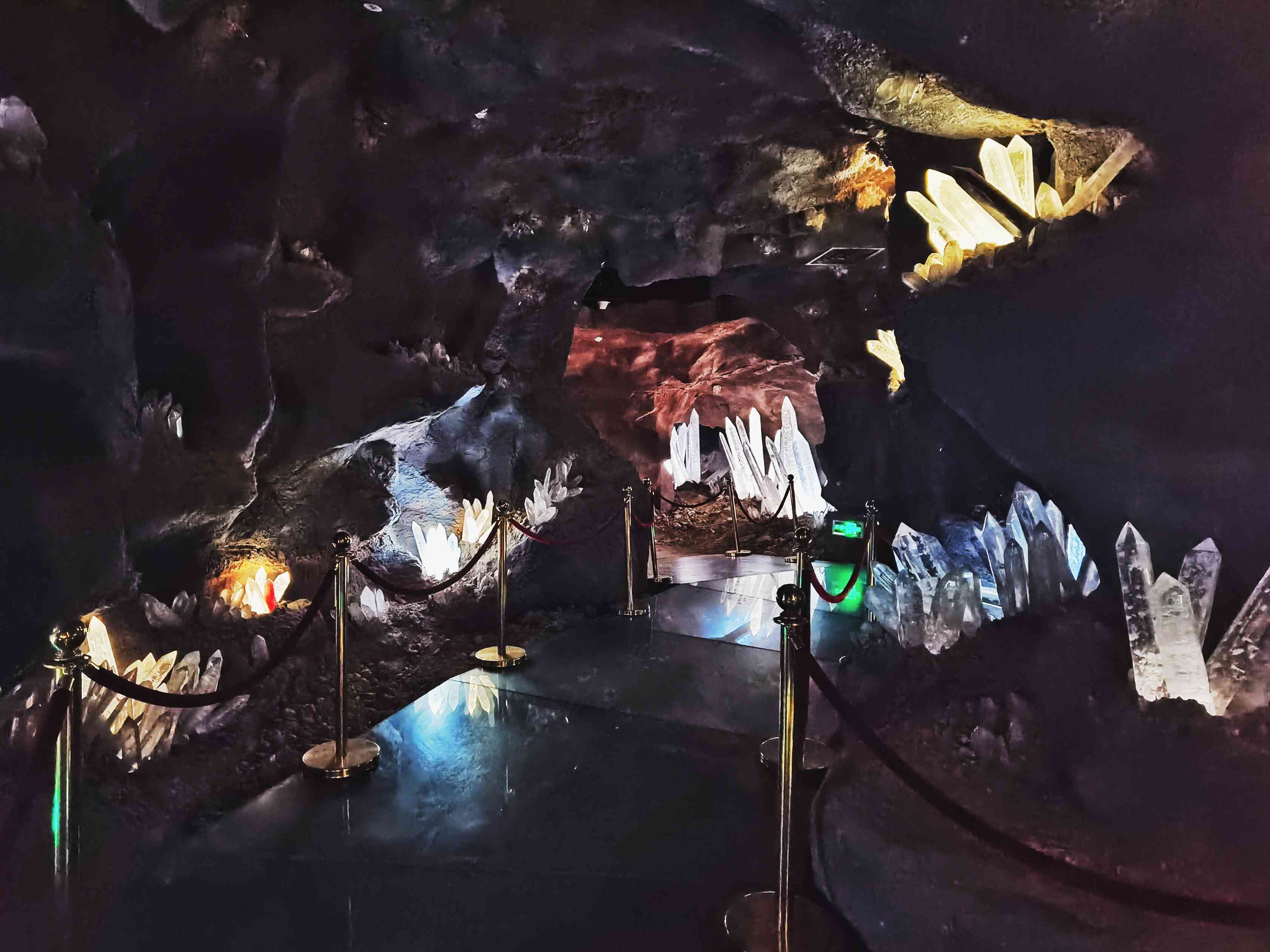 我從講述水晶起源的“開天辟地”展廳開始參觀,展廳名副其實地布置出了天地初開、火山爆發(fā)的場景,隨著我穿梭在幽暗的“地底隧道”,天空雷鳴電閃、巖漿猛烈噴發(fā),仿佛穿梭時光回到了億萬年前。然后我踏進(jìn)了一條漫長的水晶礦洞,嶙峋的巖壁上布滿了水晶,在一片黑暗中閃爍著璀璨的光芒,巨大的水晶柱拔地而起,流淌的光彩仿佛有靈一般,讓我心旌搖曳。