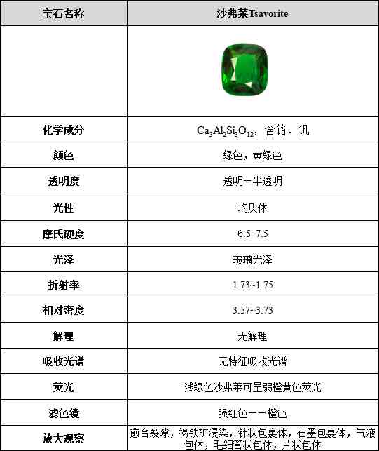 沙弗萊,又被稱為鉻釩鈣鋁榴石,是石榴石大家族中的重要成員,分子式為Ca3Al2Si3O12,微量的釩或鉻為寶石提供了鮮艷的綠色。沙弗萊的基本寶石學性質如下所示: