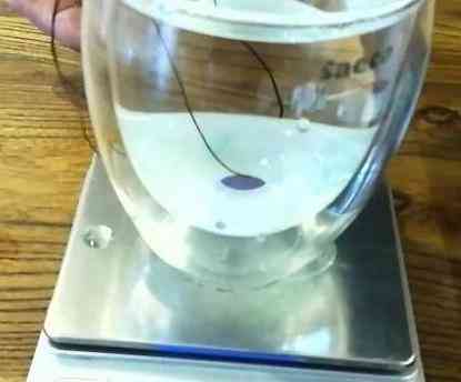 將翡翠與絲線連接,在精密電子天平上放置一杯清水,清零;將翡翠放在杯中,記下重量;用絲線提起翡翠,不超過(guò)水面,但始終遠(yuǎn)離杯子底部,再次記錄重量。