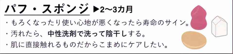 美妝蛋、粉撲:一般使用壽命在2~3個(gè)月,但個(gè)人可以根據(jù)使用感受判斷是否需要更換。如果臟了建議用中性洗滌液清洗,因?yàn)槭呛推つw直接接觸的,所以要勤洗勤換。
