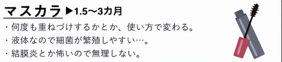 睫毛膏:一般開封后1個(gè)半月~3個(gè)月過期。因?yàn)槭且簯B(tài)的東西,所以容易滋生細(xì)菌,如果過期使用的話可能會(huì)引起結(jié)膜炎。