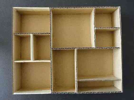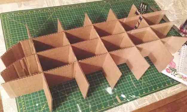 在紙箱上對(duì)照著標(biāo)記的長(zhǎng)度,剪下合適大小的紙板塊,紙板與紙板之間,剪一刀開個(gè)口,使互相之間可以插穩(wěn)。