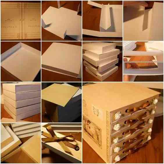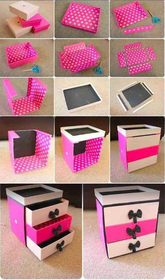 把紙板裁切成各尺寸的紙板進(jìn)行粘合,再用一些好看的禮物紙或包裝紙貼在紙板外做裝飾,一個(gè)看上去就像是買回來的收納盒,就能收納你的針線,化妝品及各種生活小物件。如果不喜歡用紙板,用復(fù)合板或泡沫板也可以進(jìn)行制作哦,如下圖。