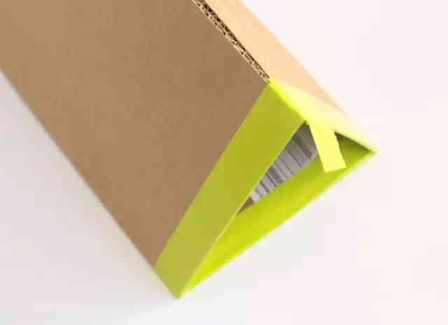 將紙板折起來變成三角形,多出的膠帶固定好接口處,用膠帶把紙板接口處粘牢。