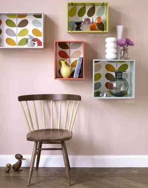 找一些自己喜歡的花紋的紙張,將其貼在盒子內(nèi)部。最后將裝飾好的盒體固定在墻面 , 擺上小裝飾就完成啦!