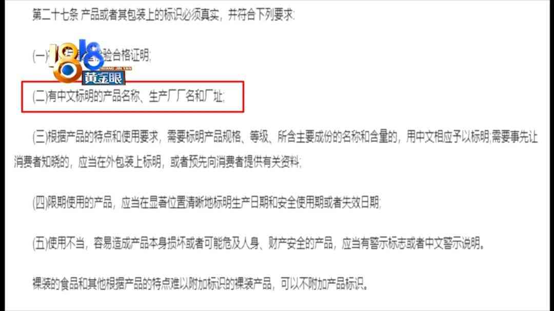 根據(jù)產(chǎn)品質(zhì)量法,產(chǎn)品或者包裝上的標識必須真實,要求有中文標明的產(chǎn)品名稱、生產(chǎn)廠名和廠址等。