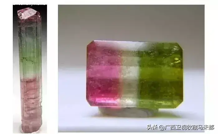 顧名思義就是碧璽內(nèi)至少有兩種顏色,雙色碧璽里以顏色分布“50/50”的品相為上佳,西瓜碧璽一般說的就是這種。