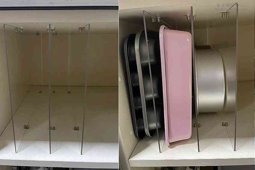例如,把隔板豎向的固定在櫥柜內,就可以實現(xiàn)鍋具、長盤等廚具的分區(qū)收納,讓柜內的空間利用更加合理,拿取也更加的方便。