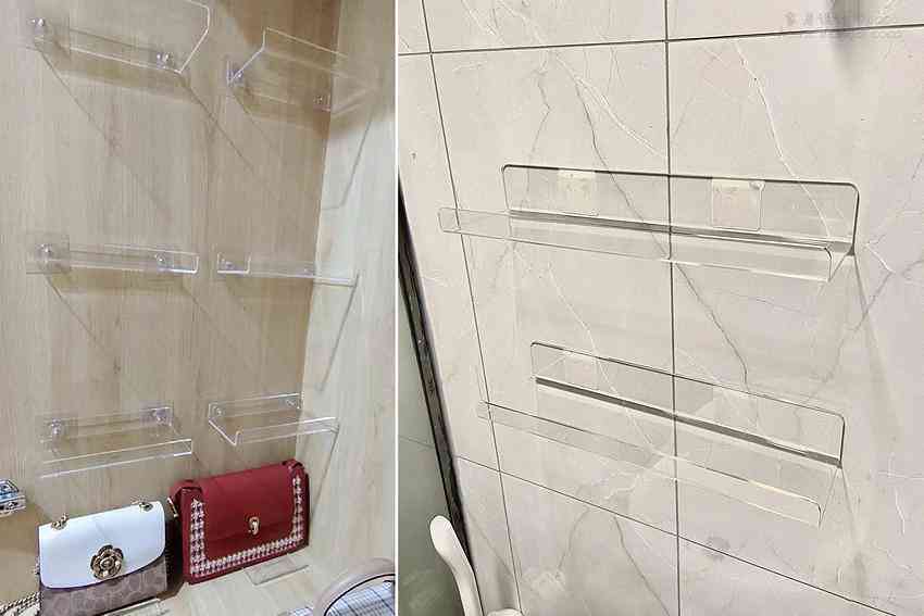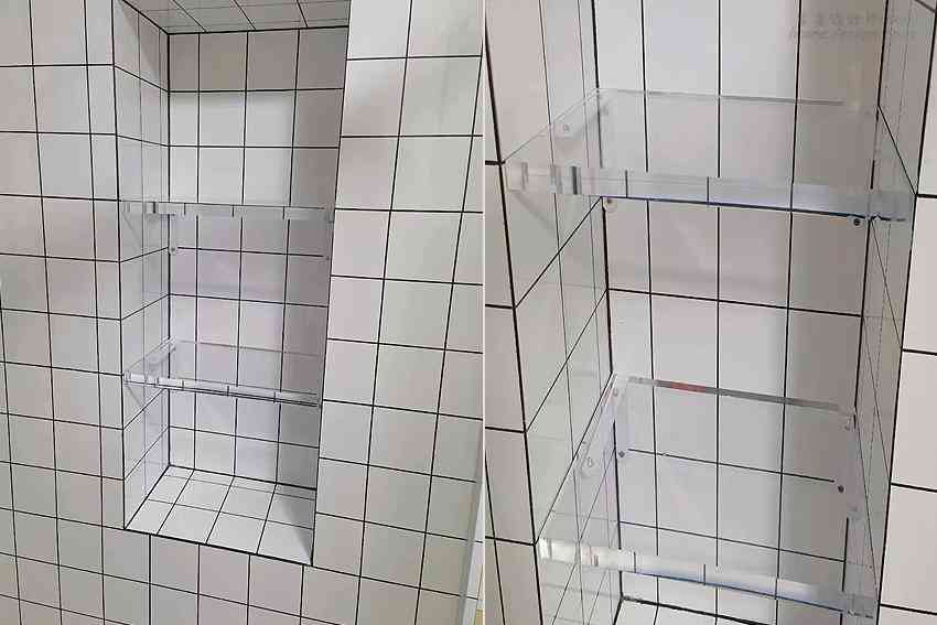 而如果利用厚一些的亞克力隔板作為壁龕的隔層,就會又省錢又好看,還可以根據(jù)自己的需求來調節(jié)高度,同時調節(jié)下坡度防止存水,關鍵是透明的設計存在感很低,毫無違和感。