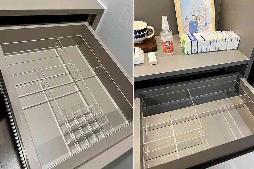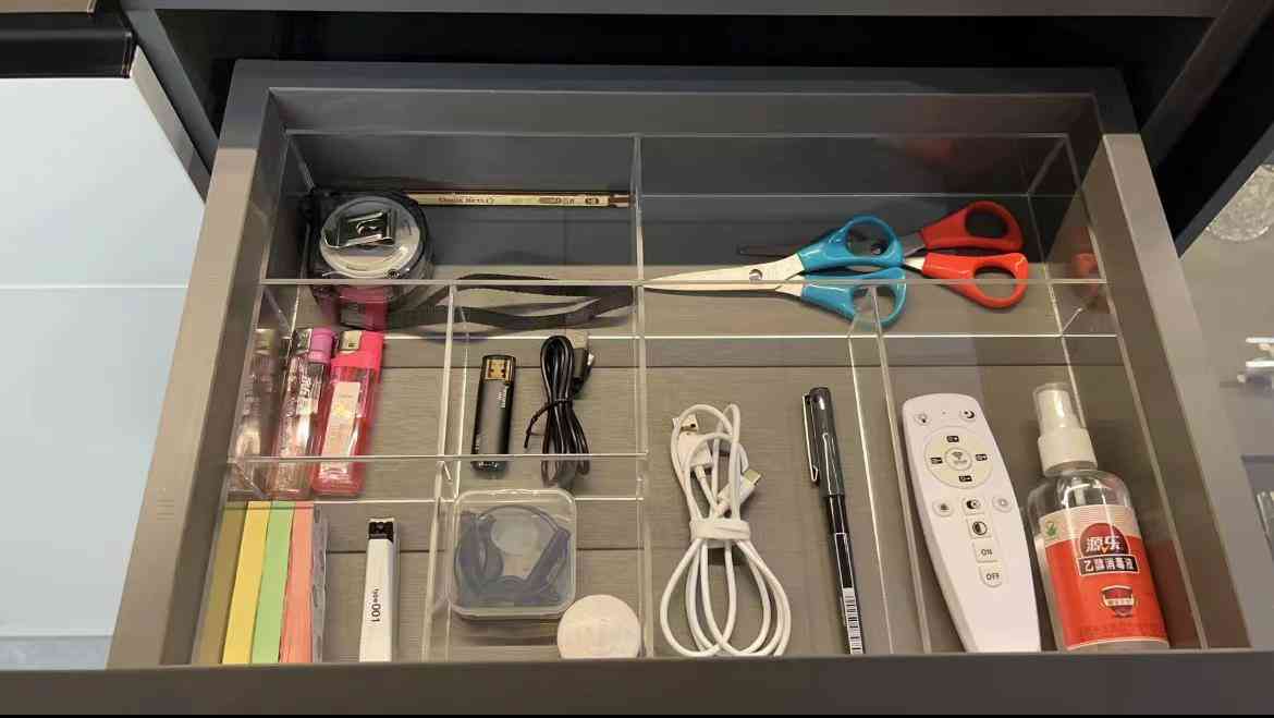 把亞克力隔板裁成小塊,放在抽屜里就是個顏值高、分區(qū)合理的收納抽屜,幾十元就能搞定,如果在全屋定制階段做這樣的抽屜要多花好幾百。