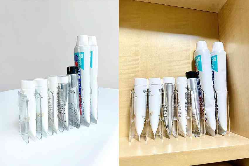 如果你把思路打開,把眼影收納盒放在衛(wèi)生間用來收納像牙膏、洗面奶等管狀的東西,你會發(fā)現(xiàn)它的用途簡直可以直接封神。