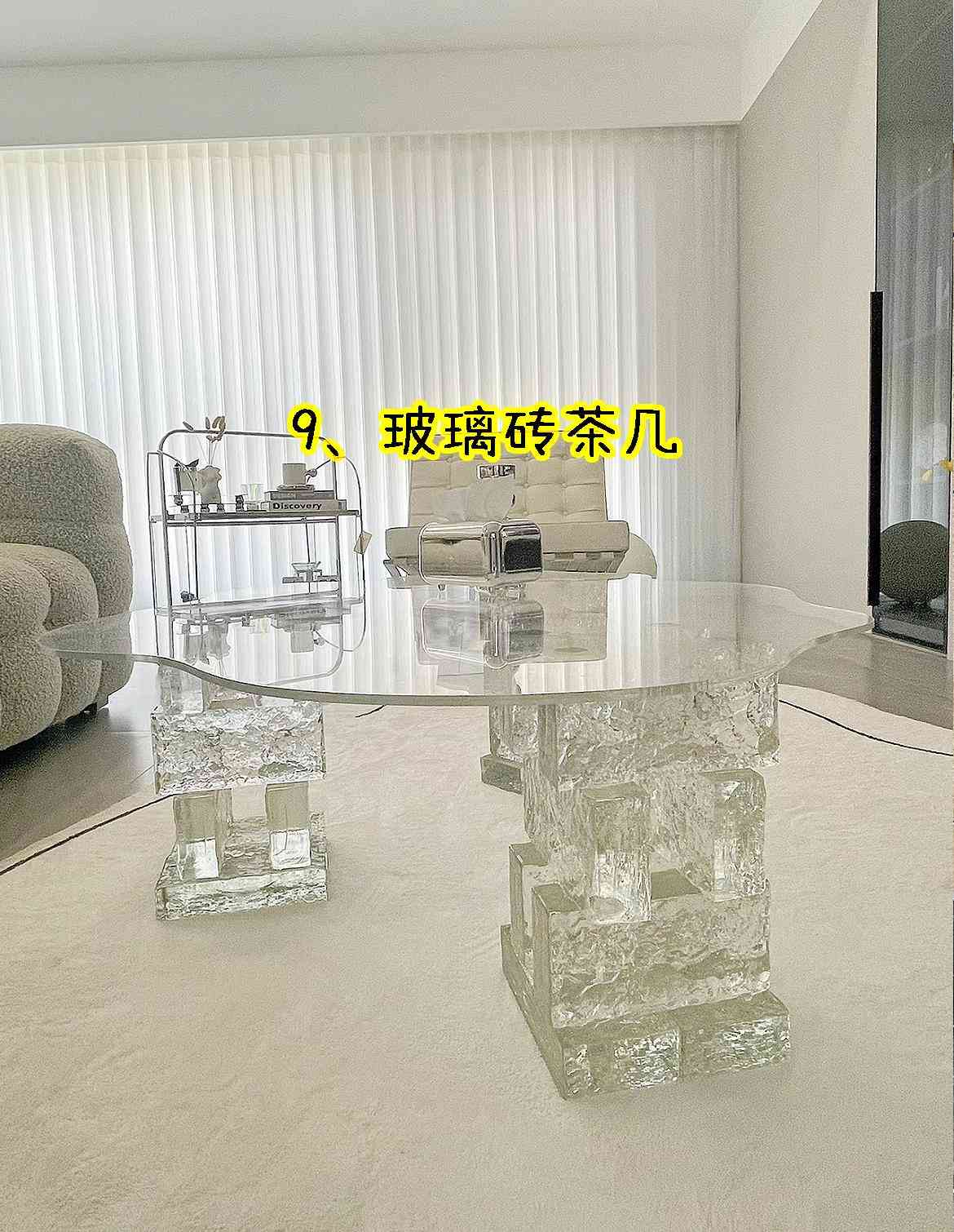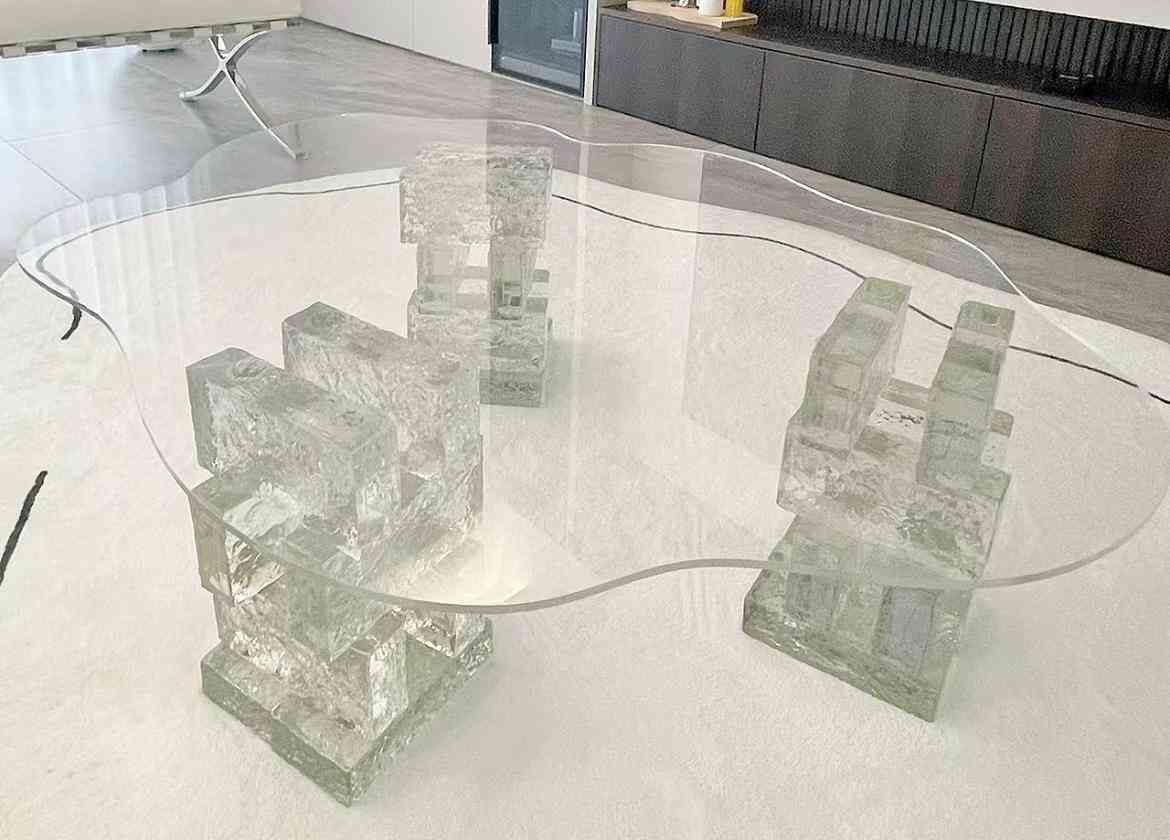 簡單的把玻璃磚用膠水粘結起來,就成一個懸浮感十足的桌腿,再搭配上一個亞克力的桌面,一個毫無存在感卻精致感十足的茶幾就誕生了。