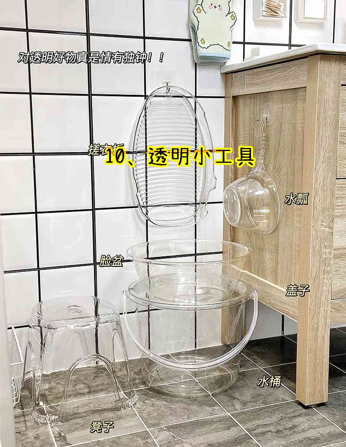 像什么小凳子、臉盆、水桶、蓋子、水瓢、搓衣板等小物,都換成透明的產品,你會發(fā)現(xiàn)即使東西再多,看起來也不會那么凌亂。