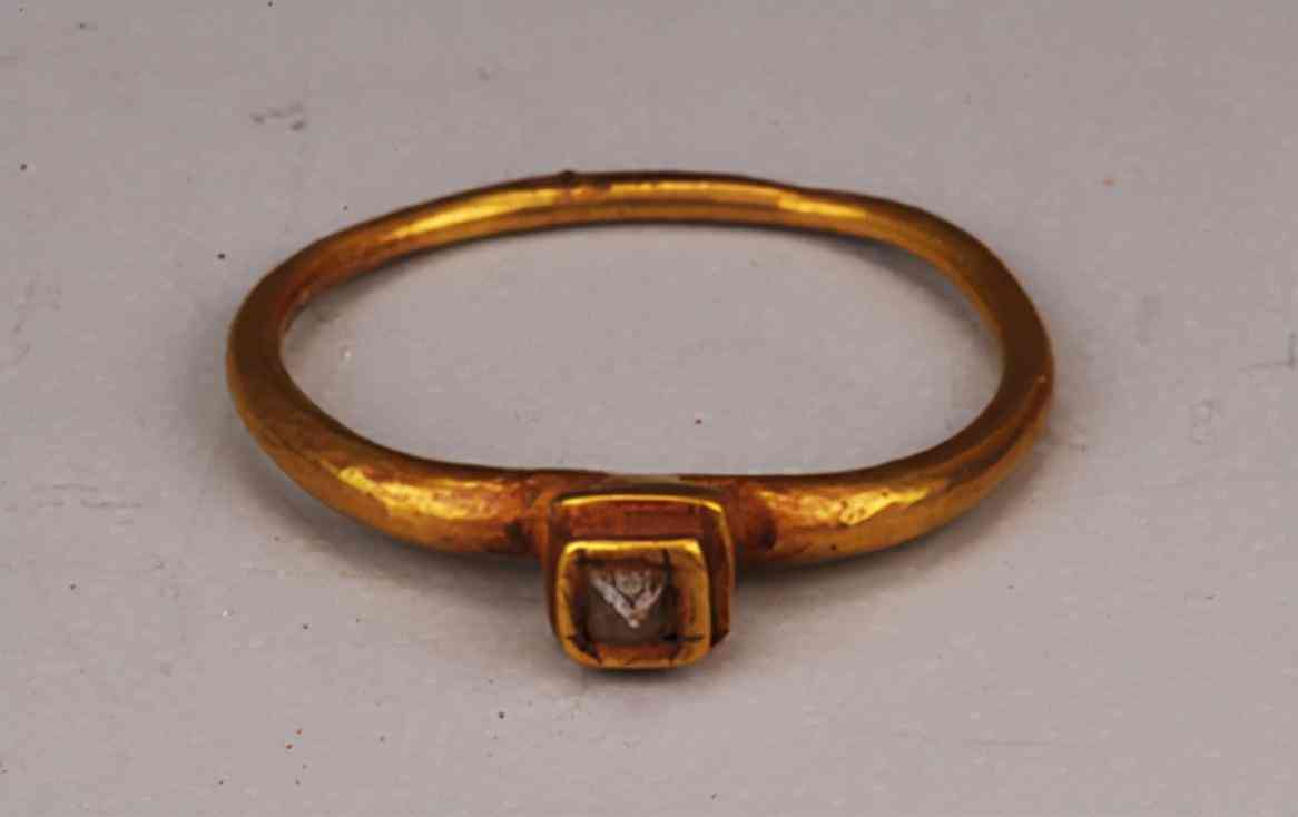 與這枚戒指一起出土的還有兩只來(lái)自于羅馬的玻璃杯,根據(jù)戒指的造型及一些資料來(lái)分析,很遺憾地將這枚戒指確定為舶來(lái)品。雖然中國(guó)的山東也有鉆石礦,不過(guò)對(duì)于鉆石開(kāi)采的歷史和作為珠寶首飾的運(yùn)用歷史明顯沒(méi)有靠前。只是一些資料明確地記載我國(guó)早期的金剛石是來(lái)自于印度的,而古印度在鉆石首飾的制作上歷史悠久,因此推測(cè)這件金剛石金指環(huán)可能是西晉年間自西域流入中國(guó)的飾品。
