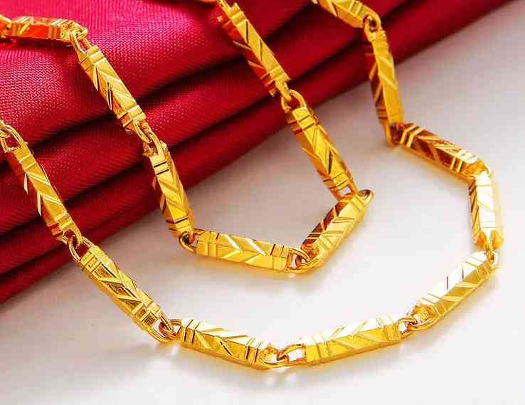 這款黃金項鏈近年比較流行,一般是結(jié)婚的時候會買這種黃金項鏈款式,整條鏈子就像一根根竹節(jié)組成,無論是男女佩戴起來都不會違和,男士可以佩戴粗一點的,女士可以佩戴細(xì)一點的。