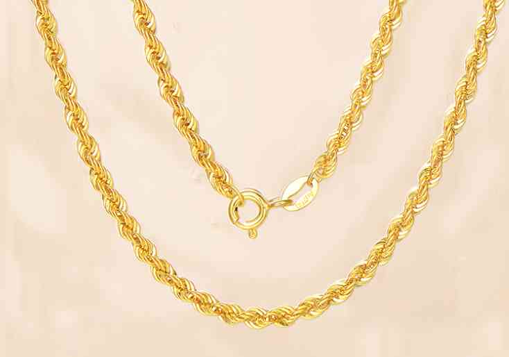 外形就像麻繩,也繼承了麻繩的特點,結(jié)構(gòu)結(jié)實,柔順不易打結(jié),不易斷裂,是一條非常經(jīng)典的黃金項鏈。如果你需要搭配一些比較大的吊墜,麻繩鏈就是非常不錯的選擇。