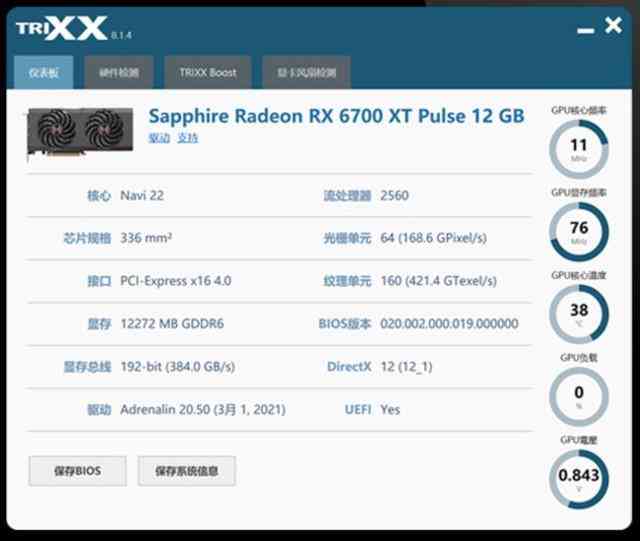 性能方面,藍(lán)寶石RX 6750 XT超白金顯卡擁有2560個(gè)流處理器,核心頻率2554-2623MHz,內(nèi)建96MB的Infinity Cache,配備速率高達(dá)18Gbps的12GB GDDR6 顯存,和RX 6700 XT公版相比,GPU和顯存頻率分別提高了71 MHz和19 MHz,主副BIOS設(shè)計(jì)在控制軟件中可以方便的進(jìn)行標(biāo)準(zhǔn)和超頻性能切換。同時(shí)供電部分結(jié)合GPU高頻特性做加強(qiáng),為整張顯卡提供充足的供電保障。