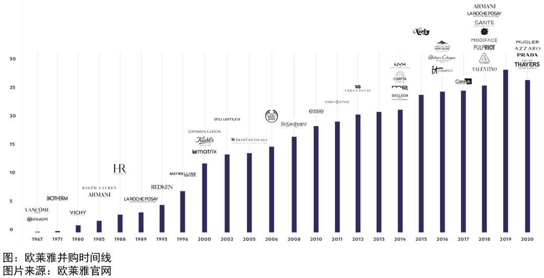 采取多品牌的戰(zhàn)略,從高端市場(chǎng)向低端市場(chǎng)滲透。化妝品市場(chǎng)的更新?lián)Q代很快,每隔一段時(shí)間就會(huì)出現(xiàn)新的風(fēng)向。一個(gè)化妝品公司要想長(zhǎng)遠(yuǎn)地生存,除了有持續(xù)不斷的研發(fā)作為底層的支撐,還需要在各個(gè)細(xì)分領(lǐng)域廣泛的布局,這樣化妝品公司就永遠(yuǎn)走在行業(yè)最前沿??v觀歐萊雅的發(fā)展,并購(gòu)是其不可或缺的一個(gè)關(guān)鍵詞。從1967年到2020年歐萊雅,收購(gòu)了40個(gè)國(guó)際大品牌,涉及護(hù)膚品、美妝、美發(fā)、香水等多個(gè)領(lǐng)域。