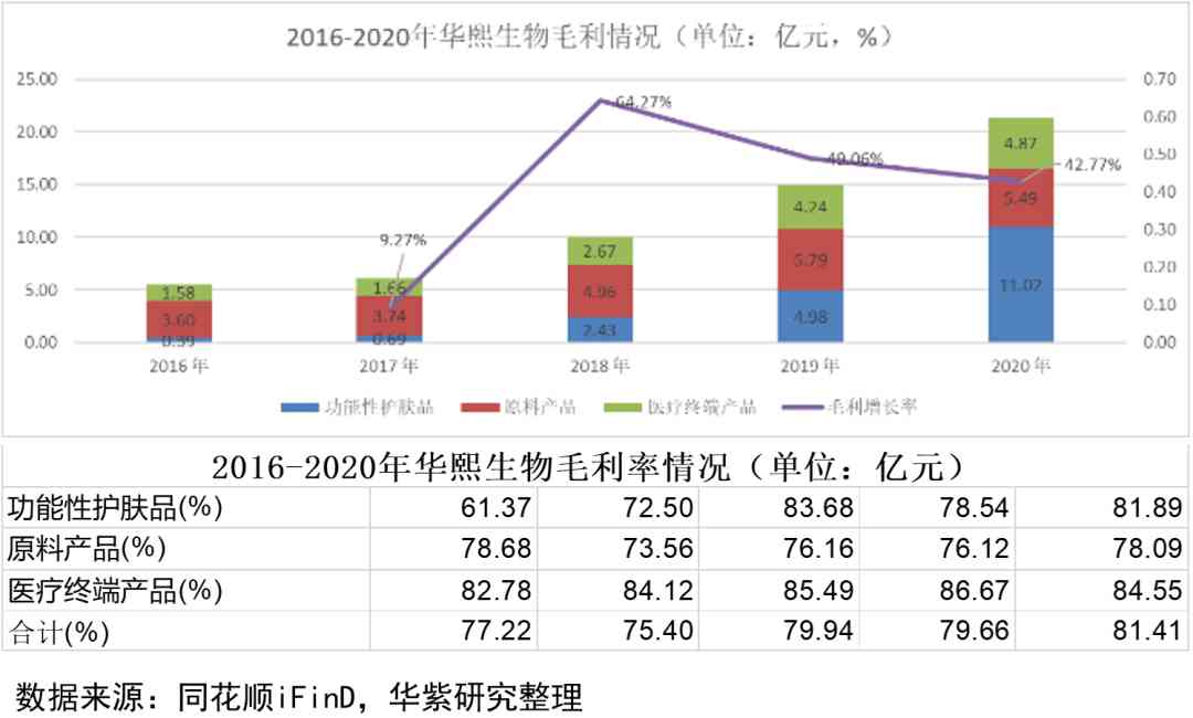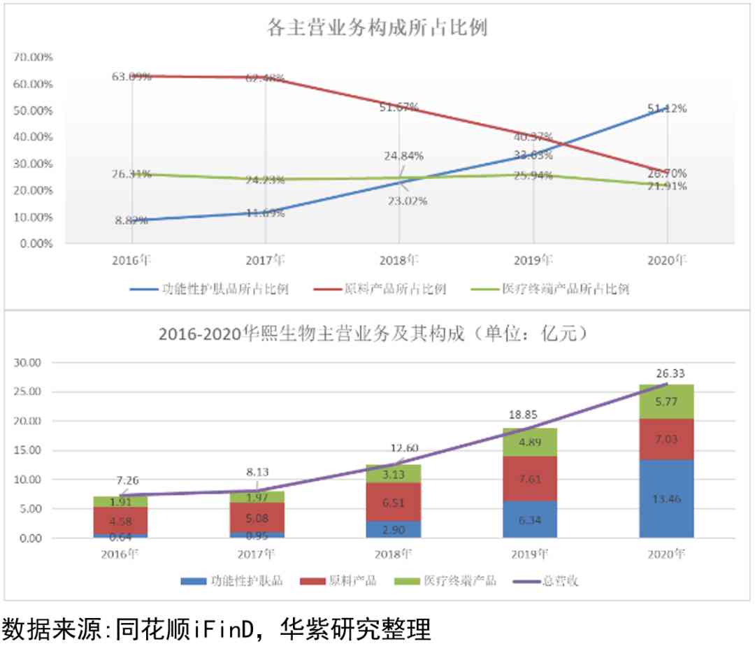 我們從華熙生物主營(yíng)業(yè)務(wù)占比變化來(lái)看,功能性護(hù)膚品是其未來(lái)主要的業(yè)績(jī)方向。近5年華熙生物的營(yíng)收保持了較快速度的增長(zhǎng),從2016年的7.26億元到2020年的26.33億元,翻了將近4倍。而我們很明顯地看到,其主營(yíng)業(yè)務(wù)結(jié)構(gòu)發(fā)生著顯著的變化,原料產(chǎn)品的占比處于不斷下降之中,而功能性護(hù)膚品所占比重一路抬升,在2020年已經(jīng)占據(jù)總營(yíng)收的51.12%。主要是因?yàn)槿A熙生物對(duì)于透明質(zhì)酸原料產(chǎn)品的供給已經(jīng)處于飽和狀態(tài),其給營(yíng)收帶來(lái)的增長(zhǎng)已經(jīng)乏力,因此這部分業(yè)務(wù)帶來(lái)的營(yíng)收處于緩慢增長(zhǎng)當(dāng)中,對(duì)營(yíng)收的貢獻(xiàn)度不斷下降;功能性護(hù)膚品賽道作為引領(lǐng)護(hù)膚品行業(yè)發(fā)展的新方向,表現(xiàn)出了營(yíng)收的極高增速。
