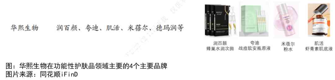 下面我們著重對(duì)華熙生物的功能性護(hù)膚品業(yè)務(wù)做一個(gè)詳細(xì)的介紹。在這一業(yè)務(wù)板塊,華熙生物手握四大核心品牌——“潤(rùn)百顏”、“夸迪”、“米蓓爾”和“BM肌活”,在2020年它們分別實(shí)現(xiàn)收入5.65億元、3.91億元、1.99億元、1.13億元,四大品牌合計(jì)貢獻(xiàn)12.68億元,占總營(yíng)收的48.16%。